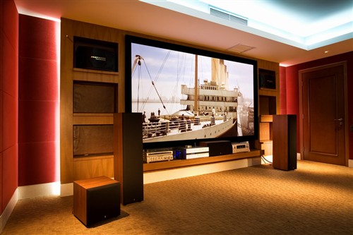 在设计中,整个视听室不仅要流露出温馨与舒适的感觉,同时还需要考虑到对周围邻居的影响,如果让邻居经常听到震耳欲聋的“爆炸”声,那么你可能很快就会成为“小区公敌”了,所以对视听室进行隔音处理是非常重要的,这也是专业视听室与普通家庭影院的主要区别。此外,在一些设计方案里,也经常看到视听室建在地下室,这样确实可以有效地避免扰民问题。